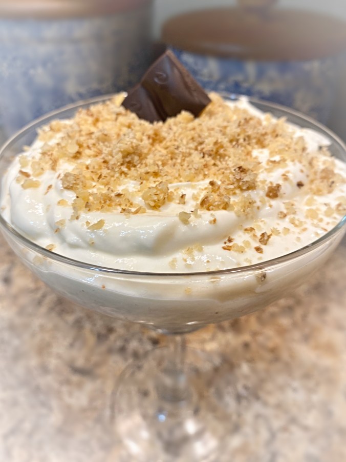 Before serving / eating: Spoon individual servings of mousse into a bowl or tall glass cup if you want to make it pretty. You can layer the mousse with fresh berries, slices of bananas, sprinkle nuts, coconut, chocolate, etc. on top. For example: If you’ve made your mousse with banana cream pudding powder, layer the mouse with sliced bananas and crush a graham cracker or vanilla wafers on top for a banana pudding dessert. If using a gelatin powder such as lime or orange: Adding pineapple or mandarin orange slices to your serving of mousse immediately before eating = DELISH.
