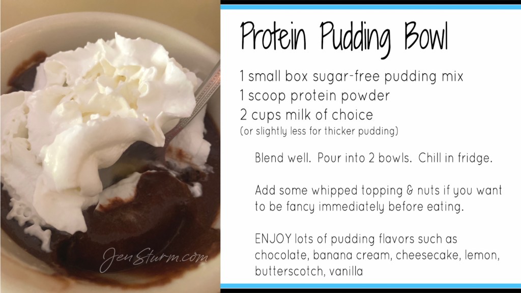 Looking for a protein-rich snack that will satisfy your sweet tooth without guilt? How about a bowl of protein pudding that I also call “pie in a bowl”. Oh yea. Let’s have a bowl shall we? Get creative with the combinations such as: use banana cream pudding mix to make your protein pudding, add sliced bananas, whipped cream and crush up a graham cracker or a couple vanilla wafers on top right before eating.